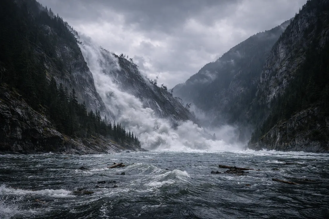 The wave did not begin in the open ocean. A strong earthquake shook the steep mountains surrounding the bay and triggered a massive landslide. Millions of tons of rock crashed into the water and forced it upward in a sudden surge. Events of this kind are usually described as megatsunamis.